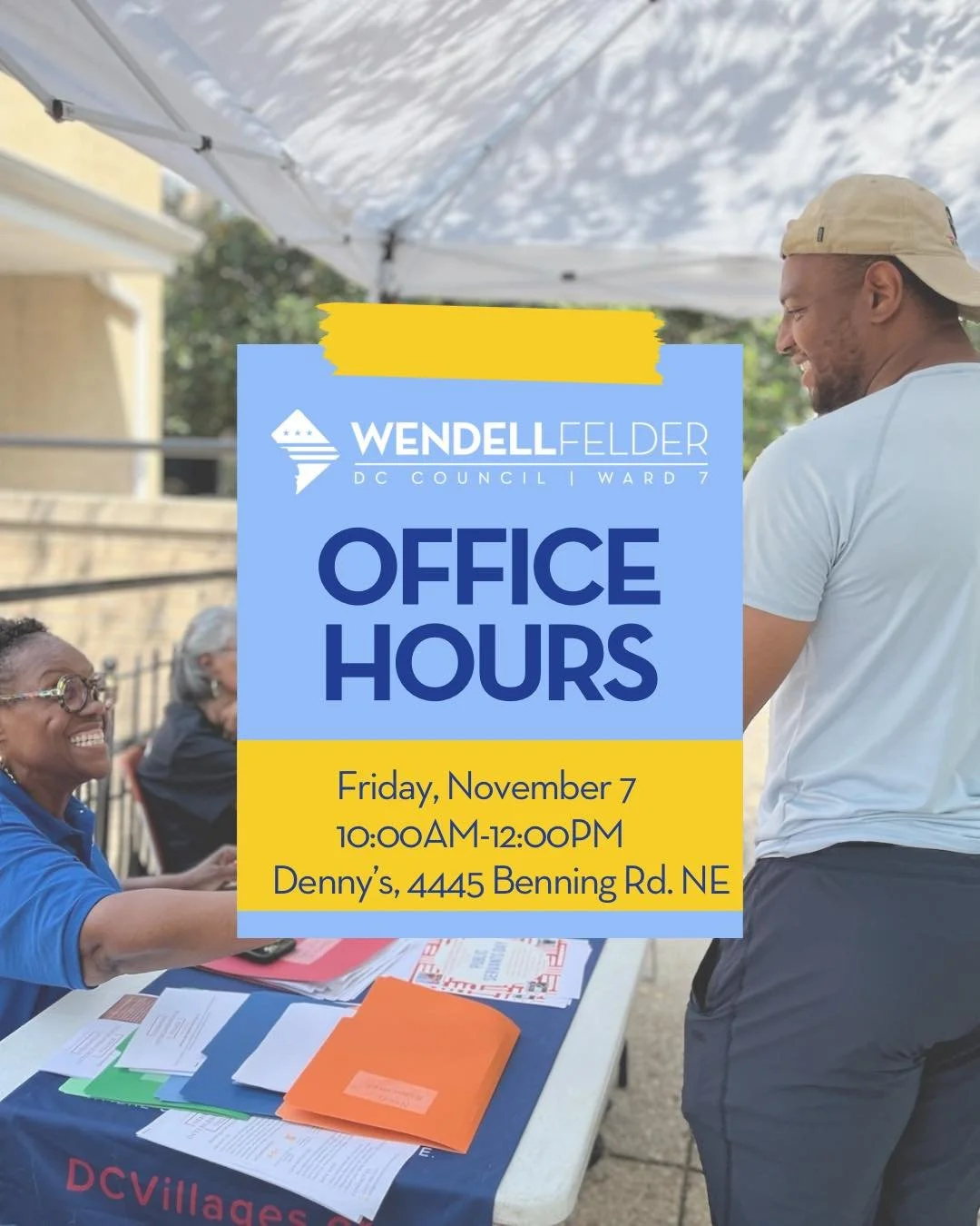Join us this Friday, November 7th, for our second Office Hours! My team and I will be at Denny’s on Benning Road from 10am to 12pm. Stop by to chat and share any questions or concerns about Ward 7.